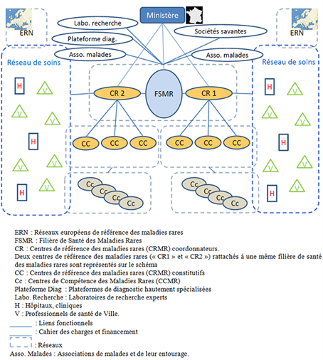 A l’échelle nationale, les centres de référence des maladies rares sont rattachés à des Filières de Santé des Maladies Rares (FSMR) portant sur des groupes de maladies rares présentant des aspects communs.